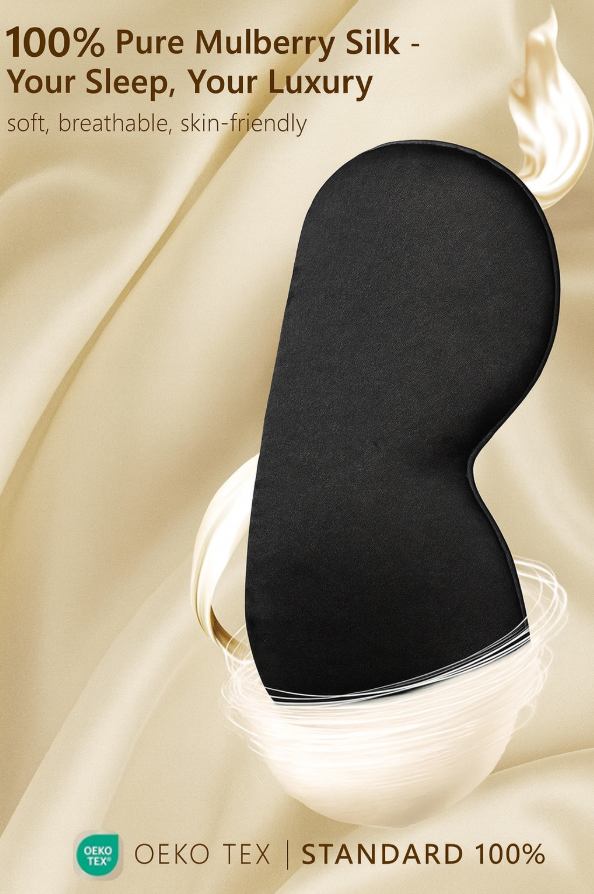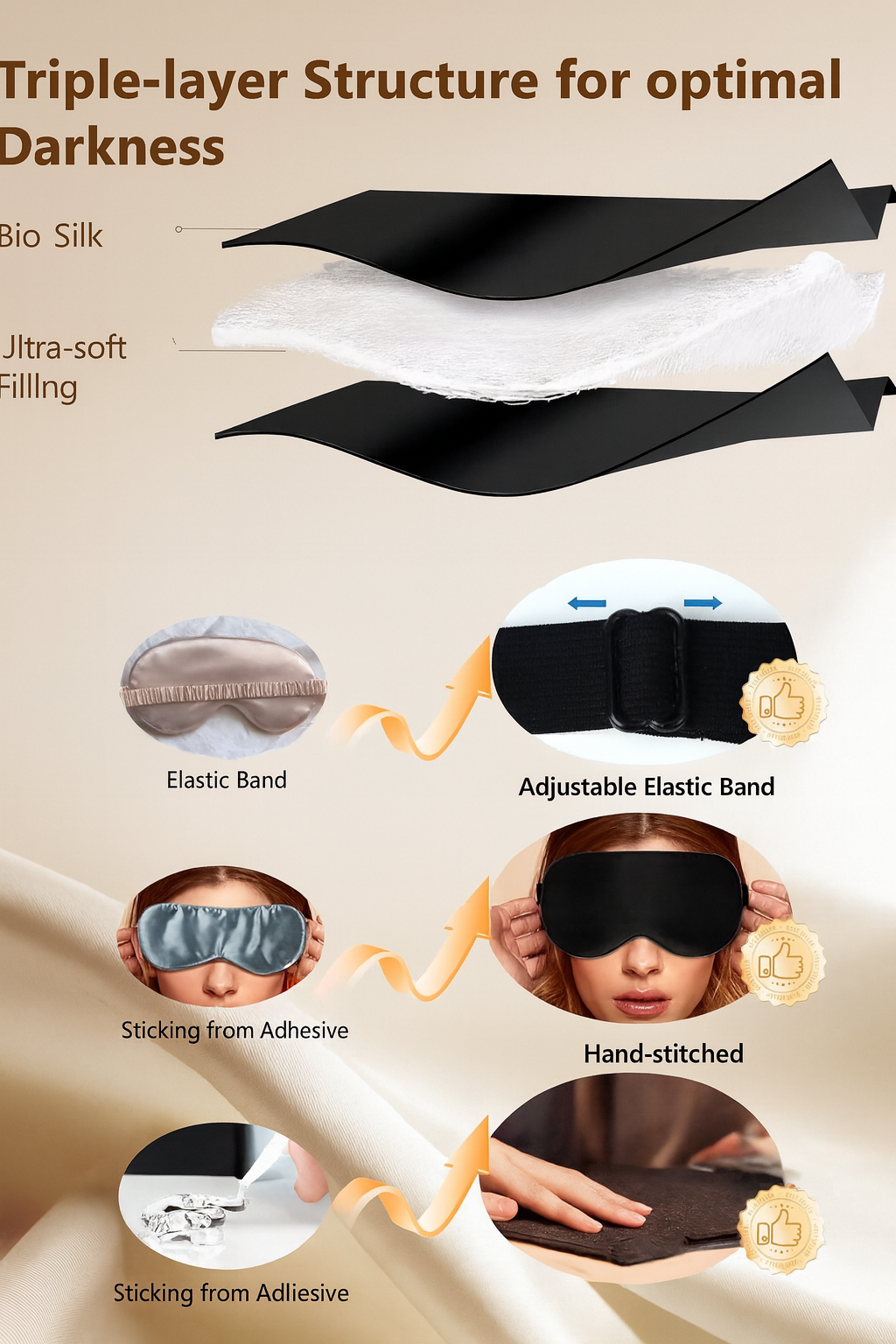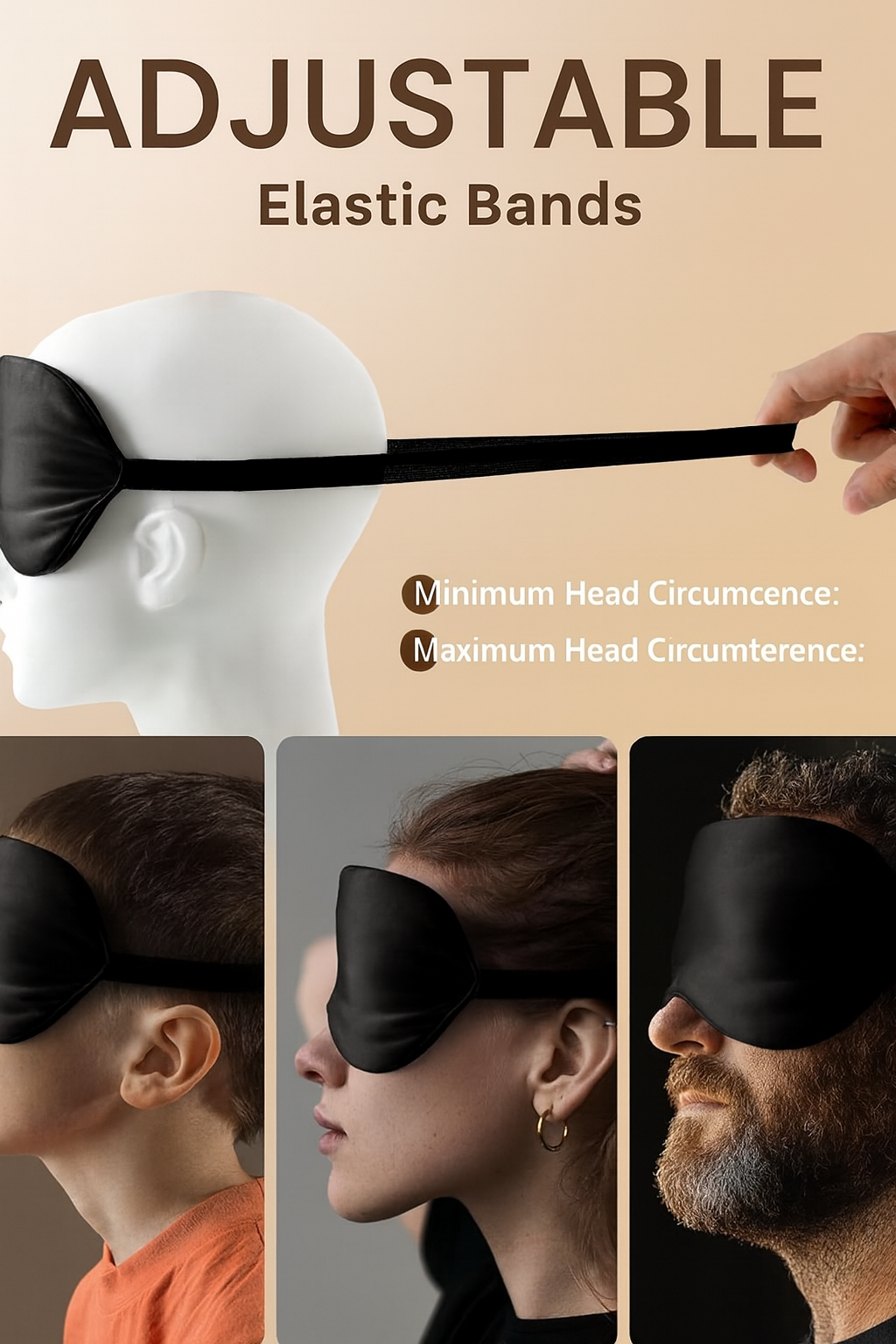 Maskas aizmugure ir veidota no dziļi melna zīda, kas efektīvi bloķē gaismu un rada optimālus apstākļus miegam. Ergonomiskā forma ar deguna ielocēm nodrošina ciešu piegulšanu un neļauj gaismai iekļūt zem maskas. Augstas kvalitātes, regulējamās siksniņas ļauj pielāgot masku bez spiediena – ideāli gulēšanai uz muguras, sāniem, vēdera vai jebkurā citā pozā.