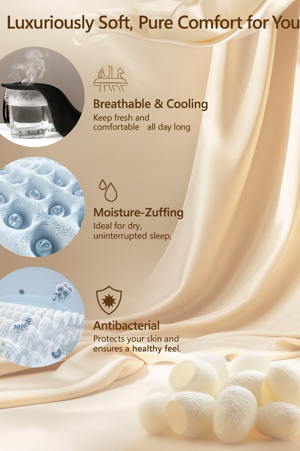 Pateicoties izcilajām mitruma regulēšanas īpašībām, zīda maska uzsūc lieko mitrumu un maigi atdod to ādai. Tas palīdz mazināt ādas sausumu, veicina aknes rašanās novēršanu un uztur acu zonu svaigu un koptu – ilgstošam komfortam arī pēc pamošanās.